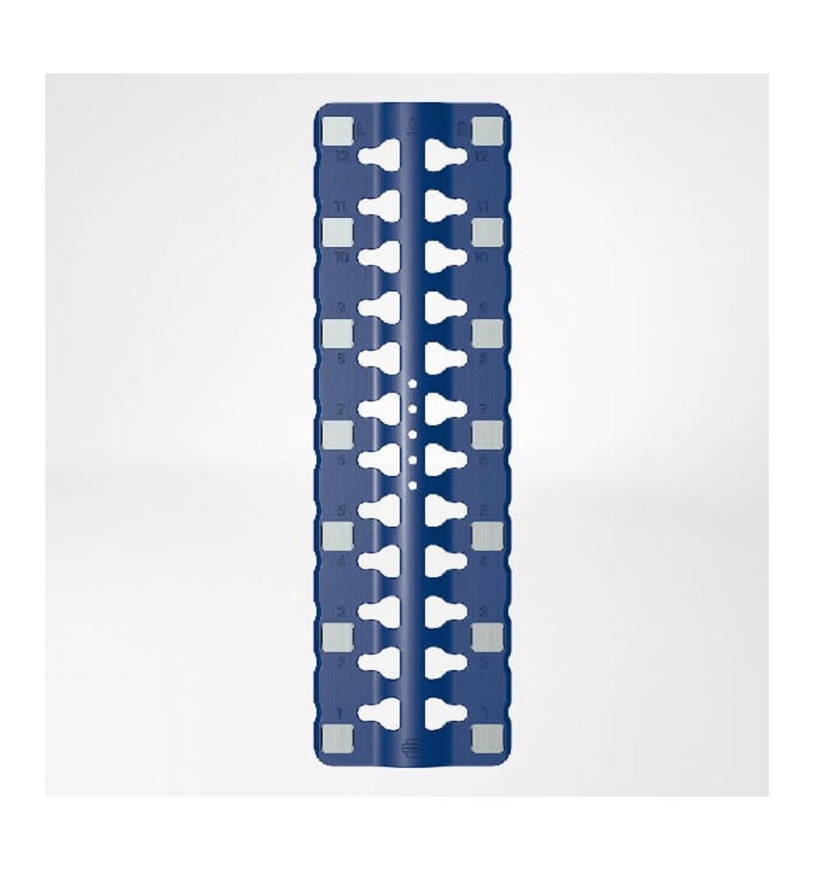 Ortesis de tejido transpirable con 8 varillas, con cinturones retensables graduables en altura y almohadilla lumbar desmontable para apoyar la lordosis natural.