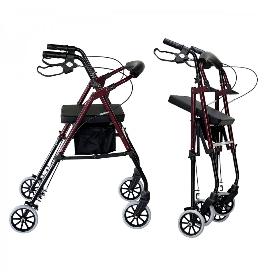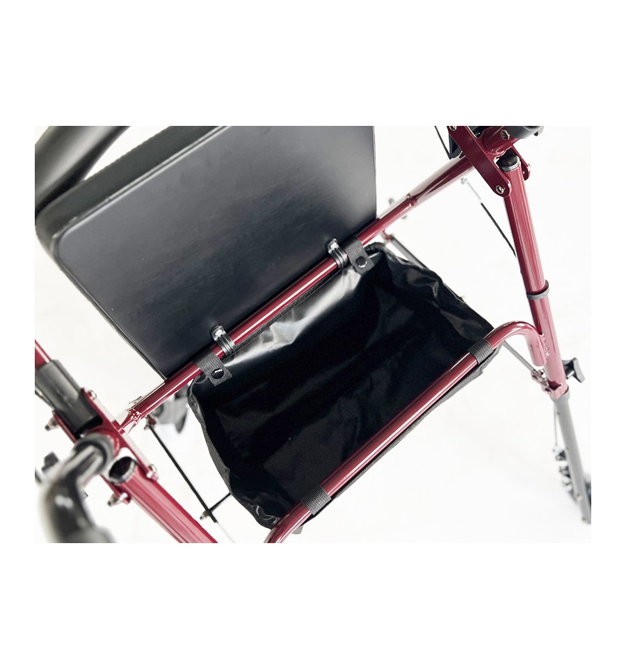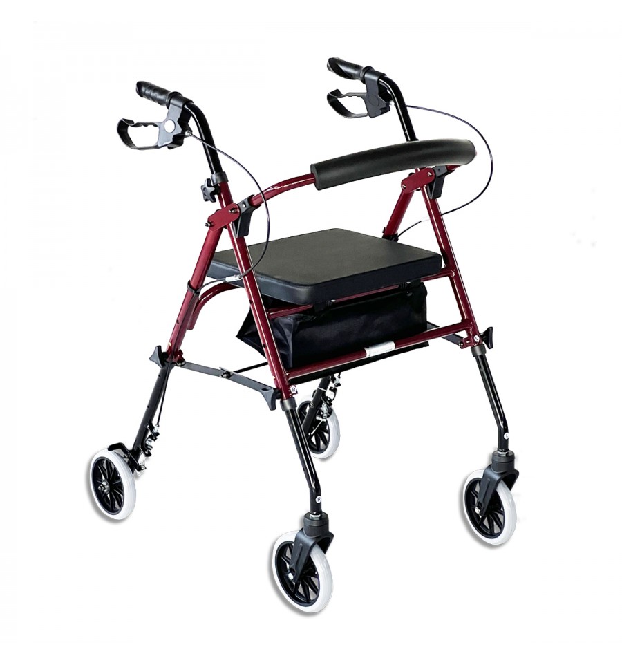 Andador o caminador de aluminio con ruedas delanteras giratorias, traseras con freno de maneta, asiento regulable en altura, cesta portaobjetos y respaldo.